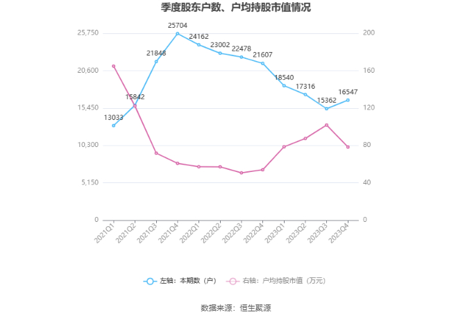 筹码集中度方面,截至2023年年末,公司股东总户数为1.65万户,较三季度末增长了1185户,增幅7.71%;户均持股市值由三季度末的101.84万元下降至78.40万元,降幅为23.02%。
