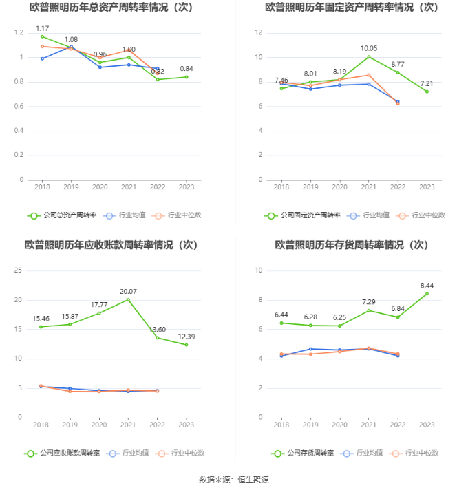 数据统计显示,欧普照明近三年营业总收入复合增长率为-0.74%,在照明设备Ⅲ行业已披露2023年数据的11家公司中排名第9。近三年净利润复合年增长率为4.92%,排名4/11。
