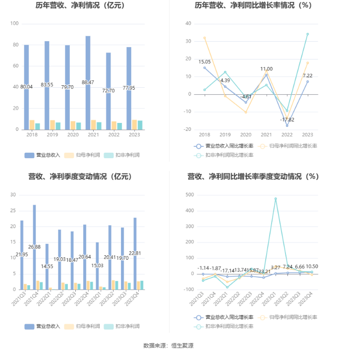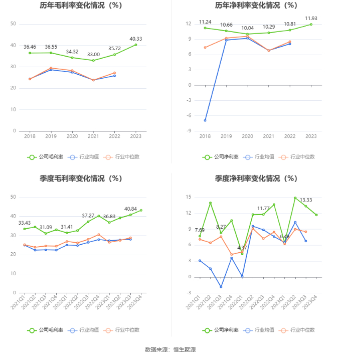 2023年,公司毛利率为40.33%,同比上升4.61个百分点;净利率为11.93%,较上年同期上升1.12个百分点。从单季度指标来看,2023年第四季度公司毛利率为43.20%,同比上升2.94个百分点,环比上升2.36个百分点;净利率为11.67%,较上年同期下降1.96个百分点,较上一季度下降1.66个百分点。