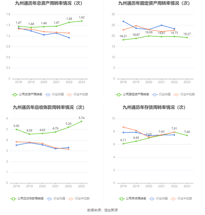 营运能力方面,2023年,公司公司总资产周转率为1.62次,上年同期为1.58次(2022年行业平均值为1.15次,公司位居同行业8/24);固定资产周转率为19.27次,上年同期为19.75次(2022年行业平均值为23.38次,公司位居同行业15/24);公司应收账款周转率、存货周转率分别为5.74次、7.40次。