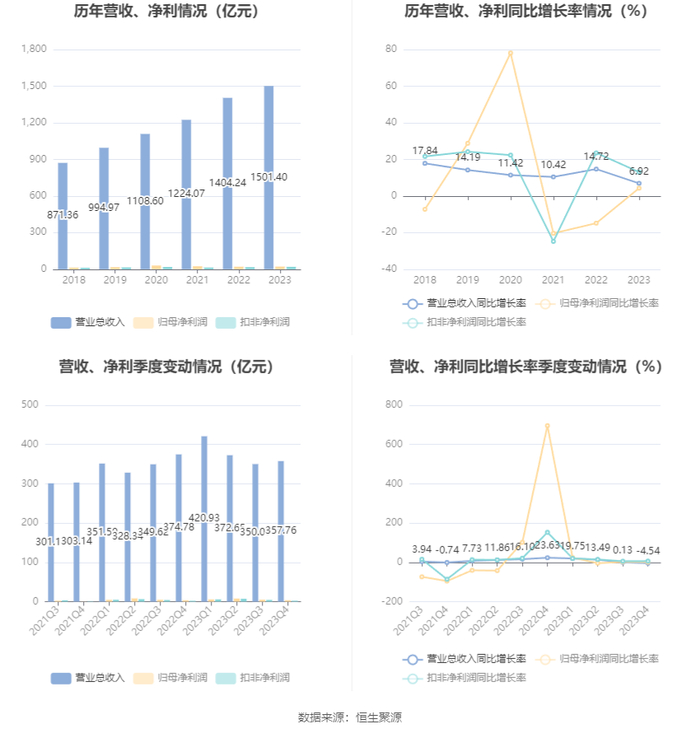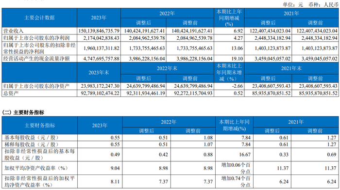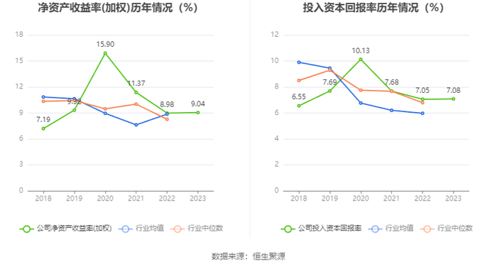 数据显示,2023年公司加权平均净资产收益率为9.04%,较上年同期增长0.06个百分点;公司2023年投入资本回报率为7.08%,较上年同期增长0.03个百分点。