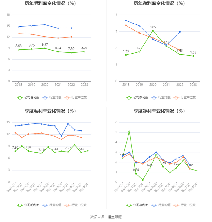 2023年,公司毛利率为8.07%,同比上升0.27个百分点;净利率为1.53%,较上年同期下降0.10个百分点。从单季度指标来看,2023年第四季度公司毛利率为7.91%,同比上升0.12个百分点,环比上升0.48个百分点;净利率为1.15%,较上年同期上升0.20个百分点,较上一季度下降0.17个百分点。