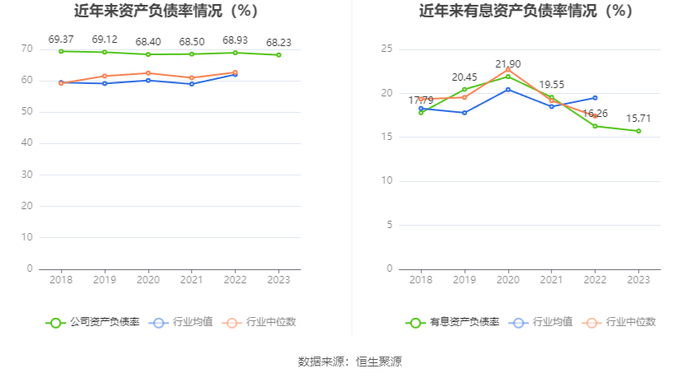 在偿债能力方面,公司2023年年末资产负债率为68.23%,相比上年末下降0.70个百分点;有息资产负债率为15.71%,相比上年末下降0.55个百分点。