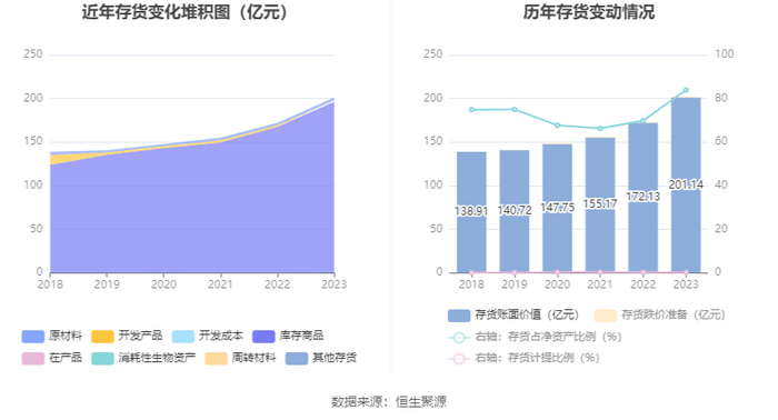 从存货变动来看,截至2023年年末,公司存货账面价值为201.14亿元,占净资产的83.87%,较上年末增加29.01亿元。其中,存货跌价准备为4524.05万元,计提比例为0.22%。