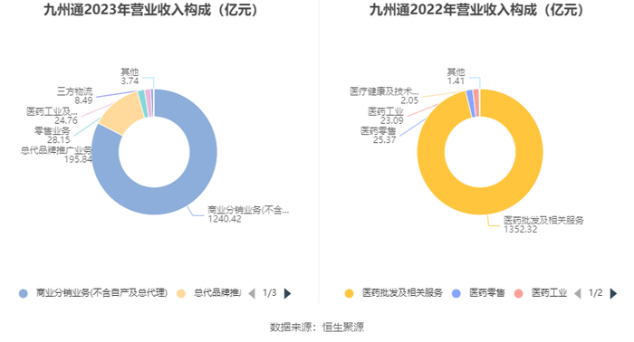 分产品来看,2023年公司主营业务中,商业分销业务(不含自产及总代理)收入1240.42亿元,占营业收入的82.62%;总代品牌推广业务收入195.84亿元,占营业收入的13.04%;零售业务收入28.15亿元,占营业收入的1.87%。