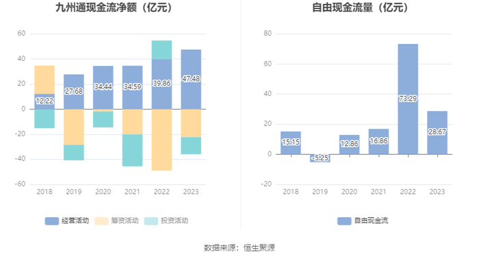 2023年,公司经营活动现金流净额为47.48亿元,同比增长19.10%;筹资活动现金流净额-22.37亿元,同比增加26.64亿元;投资活动现金流净额-13.61亿元,上年同期为14.88亿元。