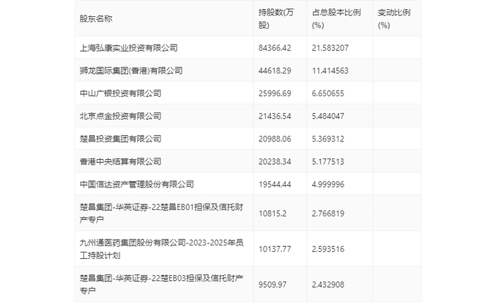 年报显示,2023年年末公司十大流通股东中,持股最多的为上海弘康实业投资有限公司,占比21.58%。十大流通股东名单相比2023年三季报维持不变。在具体持股比例上,香港中央结算有限公司持股有所上升,楚昌集团-华英证券-22楚昌EB01担保及信托财产专户持股有所下降。