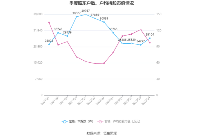 筹码集中度方面,截至2023年年末,公司股东总户数为2.81万户,较三季度末增长了3307户,增幅13.34%;户均持股市值由三季度末的121.94万元下降至97.50万元,降幅为20.04%。