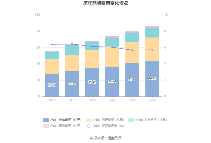 2023年,公司期间费用为86.09亿元,较上年同期增加6.22亿元;期间费用率为5.73%,较上年同期上升0.04个百分点。其中,销售费用同比增长7.03%,管理费用同比增长10.53%,研发费用同比增长10.21%,财务费用同比增长3.97%。