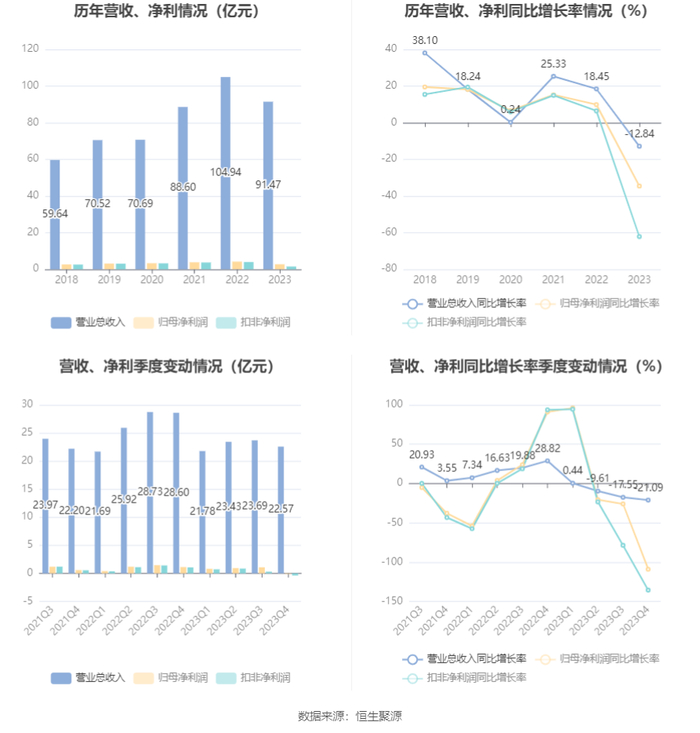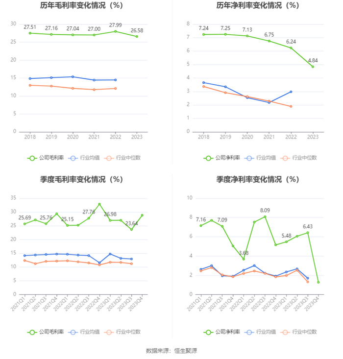 2023年,公司毛利率为26.58%,同比下降1.41个百分点;净利率为4.84%,较上年同期下降1.40个百分点。从单季度指标来看,2023年第四季度公司毛利率为28.85%,同比下降4.05个百分点,环比上升5.21个百分点;净利率为1.28%,较上年同期下降3.88个百分点,较上一季度下降5.15个百分点。