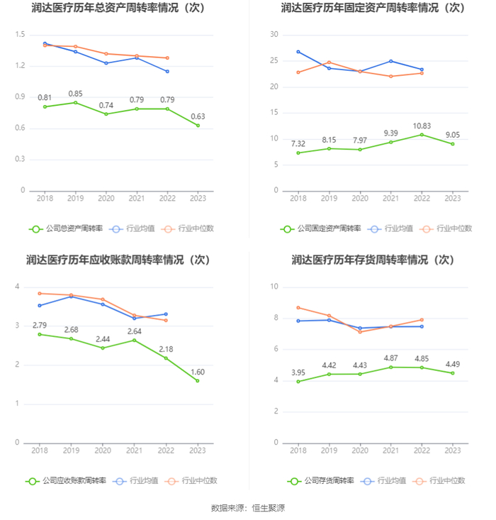 营运能力方面,2023年,公司公司总资产周转率为0.63次,上年同期为0.79次(2022年行业平均值为1.15次,公司位居同行业19/24);固定资产周转率为9.05次,上年同期为10.83次(2022年行业平均值为23.38次,公司位居同行业20/24);公司应收账款周转率、存货周转率分别为1.60次、4.49次。