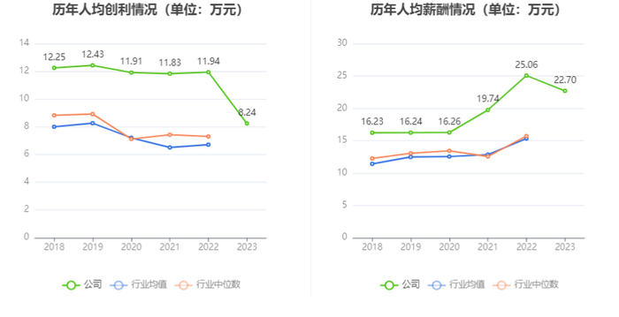 截至2023年末,公司员工总数为3315人,人均创收275.94万元,人均创利8.24万元,人均薪酬22.70万元,较上年同期分别下降8.00%、30.95%、9.43%。