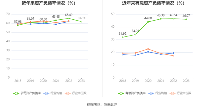 在偿债能力方面,公司2023年年末资产负债率为61.93%,相比上年末下降3.56个百分点;有息资产负债率为46.07%,相比上年末下降0.47个百分点。