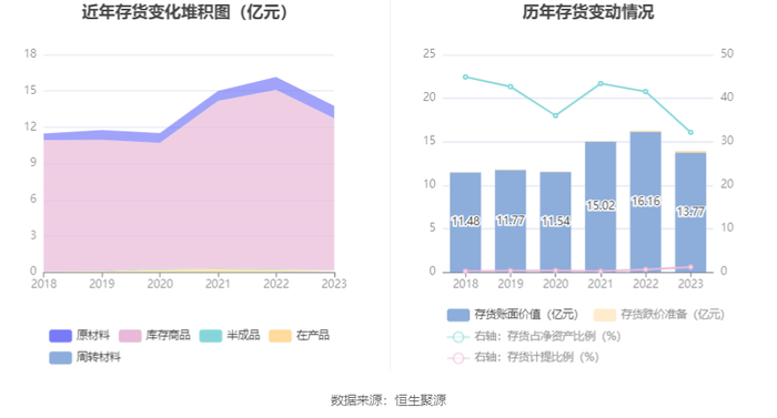 从存货变动来看,截至2023年年末,公司存货账面价值为13.77亿元,占净资产的32.17%,较上年末减少2.39亿元。其中,存货跌价准备为1689.88万元,计提比例为1.21%。