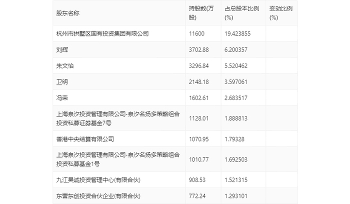 年报显示,2023年年末公司十大流通股东中,新进股东为上海泉汐投资管理有限公司-泉汐名扬多策略组合投资私募证券基金7号、上海泉汐投资管理有限公司-泉汐名扬多策略组合投资私募基金1号,取代了三季度末的太平人寿保险有限公司-传统-普通保险产品-022L-CT001沪、博恩添富7号私募证券投资基金。在具体持股比例上,香港中央结算有限公司持股有所上升,杭州市拱墅区国有投资集团有限公司、刘辉、朱文怡、卫明、冯荣、九江昊诚投资管理中心(有限合伙)、东营东创投资合伙企业(有限合伙)持股有所下降。