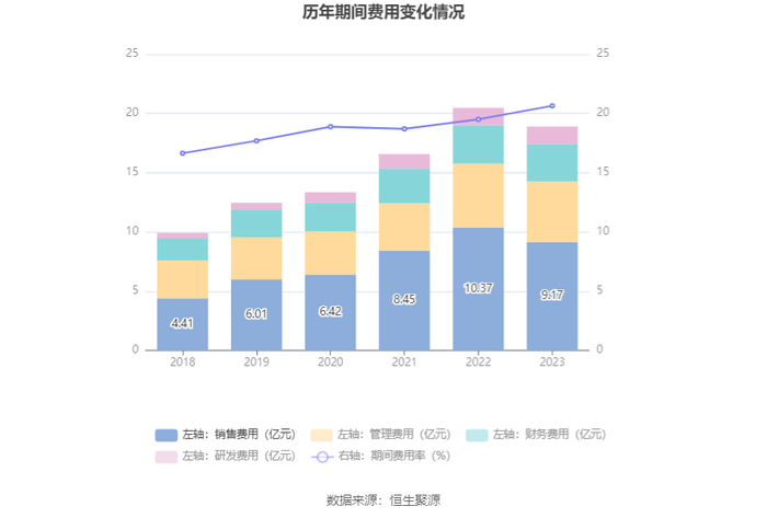 2023年,公司期间费用为18.89亿元,较上年同期减少1.59亿元;但期间费用率为20.65%,较上年同期上升1.14个百分点。其中,销售费用同比下降11.59%,管理费用同比下降6.0%,研发费用同比增长0.63%,财务费用同比下降2.14%。