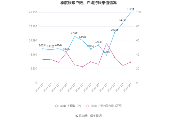 筹码集中度方面,截至2023年年末,公司股东总户数为4.11万户,较三季度末增长了6189户,增幅17.72%;户均持股市值由三季度末的24.66万元上升至29.55万元,增幅为19.83%。