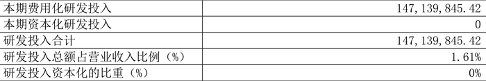2023年全年,公司研发投入金额为1.47亿元,同比增长0.63%;研发投入占营业收入比例为1.61%,相比上年同期上升0.22个百分点。此外,公司全年研发投入资本化率为0。
