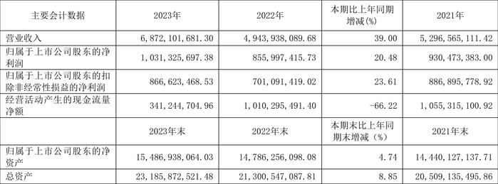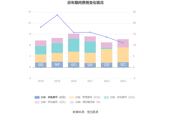 2023年,公司期间费用为7.61亿元,较上年同期增加8316.67万元;但期间费用率为11.07%,较上年同期下降2.63个百分点。其中,销售费用同比增长8.74%,管理费用同比增长8.74%,研发费用同比增长55.39%,财务费用由去年同期的3561.10万元变为-411.32万元。