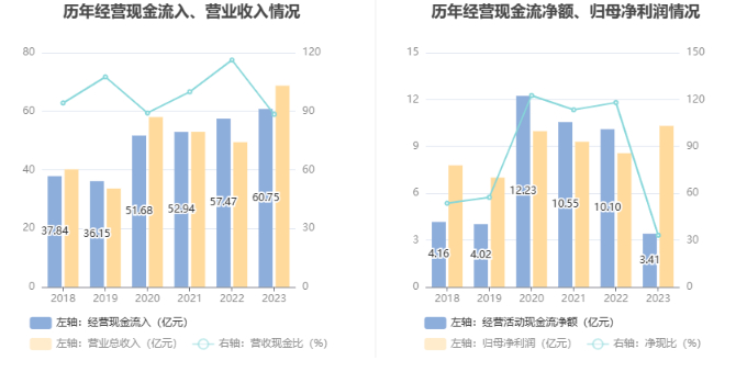 2023年,公司经营活动现金流净额为3.41亿元,同比下降66.22%;筹资活动现金流净额-6.02亿元,同比增加3.77亿元;投资活动现金流净额4.30亿元,上年同期为13.23亿元。