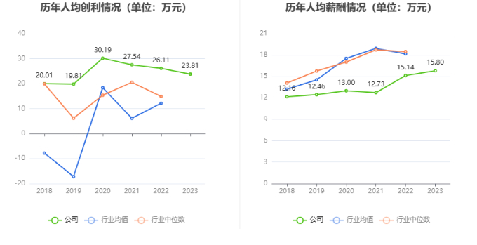 截至2023年末,公司员工总数为4332人,人均创收158.64万元,人均创利23.81万元,人均薪酬15.80万元,较上年同期分别变化5.21%、-8.80%、4.35%。