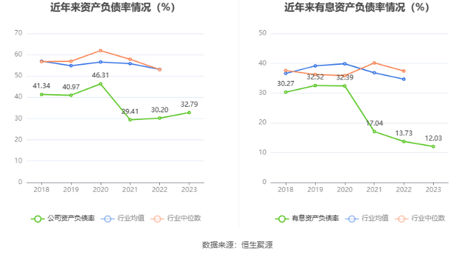 在偿债能力方面,公司2023年年末资产负债率为32.79%,相比上年末上升2.59个百分点;有息资产负债率为12.03%,相比上年末下降1.70个百分点。