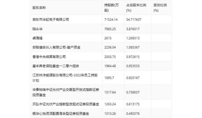 年报显示,2023年年末公司十大流通股东中,持股最多的为启东市华虹电子有限公司,占比34.72%。十大流通股东名单相比2023年三季报维持不变。在具体持股比例上,银华心怡灵活配置混合型证券投资基金持股有所上升,香港中央结算有限公司、华泰柏瑞中证光伏产业交易型开放式指数证券投资基金、天弘中证光伏产业指数型发起式证券投资基金持股有所下降。