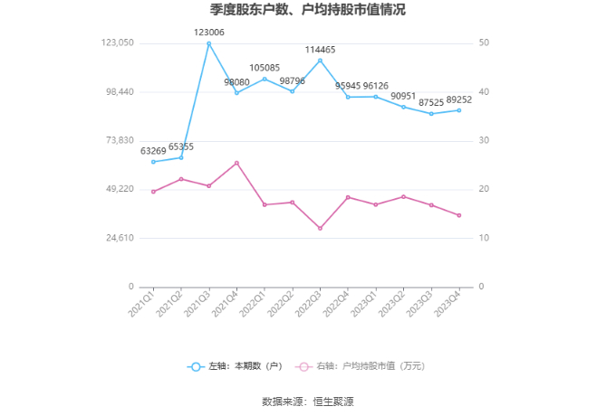 筹码集中度方面,截至2023年年末,公司股东总户数为8.93万户,较三季度末增长了1727户,增幅1.97%;户均持股市值由三季度末的16.85万元下降至14.75万元,降幅为12.46%。