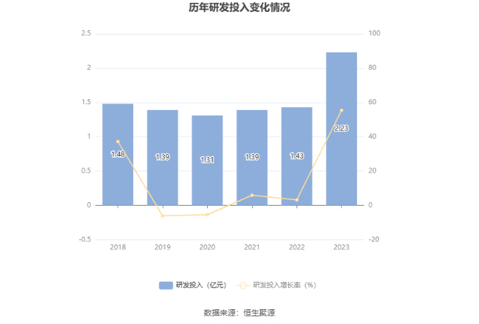 2023年全年,公司研发投入金额为2.23亿元,同比增长55.39%;研发投入占营业收入比例为3.24%,相比上年同期上升0.34个百分点。此外,公司全年研发投入资本化率为0。