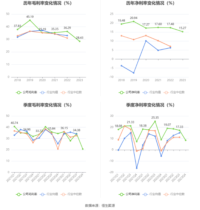 2023年,公司毛利率为28.43%,同比下降7.86个百分点;净利率为15.27%,较上年同期下降2.21个百分点。从单季度指标来看,2023年第四季度公司毛利率为20.68%,同比下降13.77个百分点,环比下降13.70个百分点;净利率为8.46%,较上年同期下降0.55个百分点,较上一季度下降8.87个百分点。