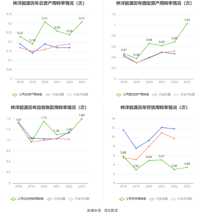 营运能力方面,2023年,公司公司总资产周转率为0.31次,上年同期为0.24次(2022年行业平均值为0.17次,公司位居同行业4/13);固定资产周转率为1.03次,上年同期为0.69次(2022年行业平均值为0.47次,公司位居同行业5/13);公司应收账款周转率、存货周转率分别为1.80次、3.46次。