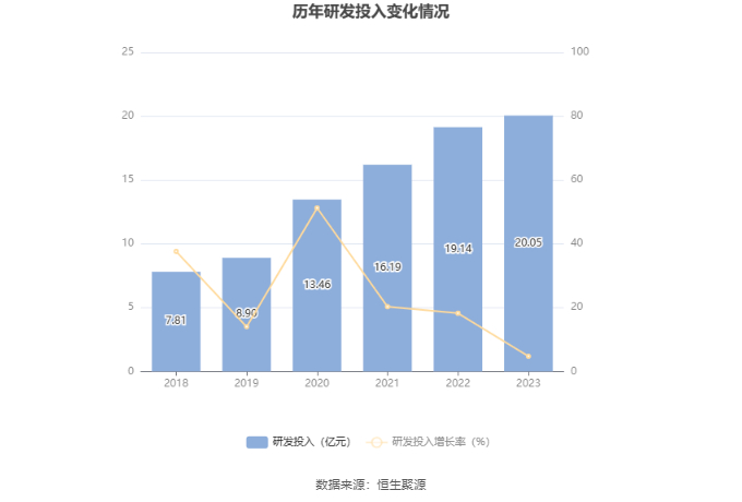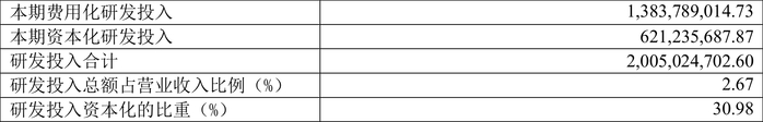 2023年全年,公司研发投入金额为20.05亿元,同比增长4.75%;研发投入占营业收入比例为2.67%,相比上年同期下降0.02个百分点。此外,公司全年研发投入资本化率为30.98%。