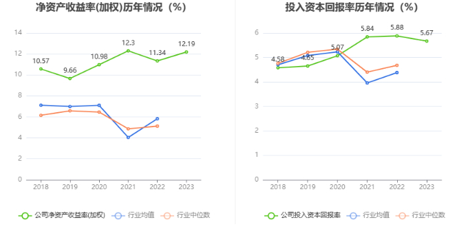 数据显示,2023年公司加权平均净资产收益率为12.19%,较上年同期增长0.85个百分点;公司2023年投入资本回报率为5.67%,较上年同期下降0.21个百分点。