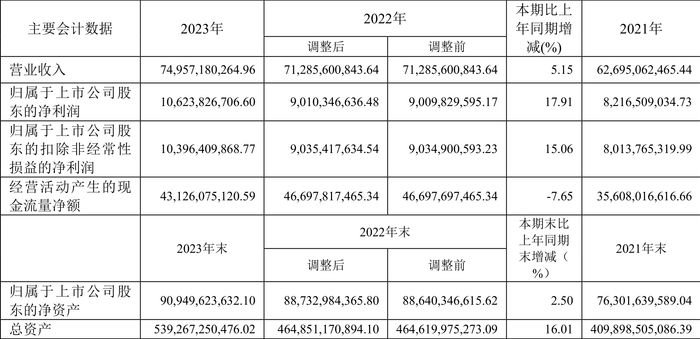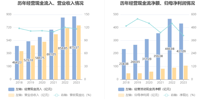 2023年,公司经营活动现金流净额为431.26亿元,同比下降7.65%;筹资活动现金流净额223.32亿元,同比增加128.96亿元;投资活动现金流净额-717.12亿元,上年同期为-530.08亿元。
