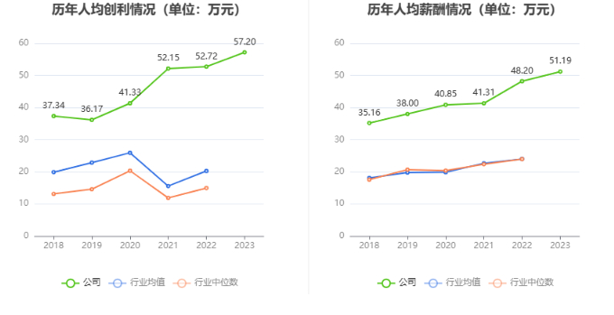 截至2023年末,公司员工总数为18574人,人均创收403.56万元,人均创利57.20万元,人均薪酬51.19万元,较上年同期分别变化-3.25%、8.49%、6.19%。