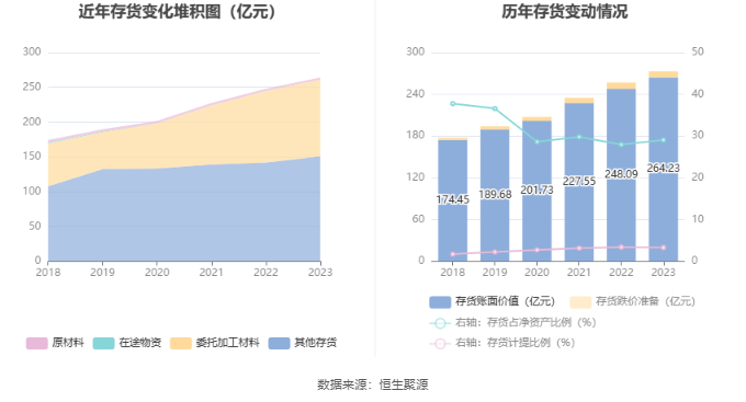 从存货变动来看,截至2023年年末,公司存货账面价值为264.23亿元,占净资产的29.05%,较上年末增加16.13亿元。其中,存货跌价准备为9.05亿元,计提比例为3.31%。