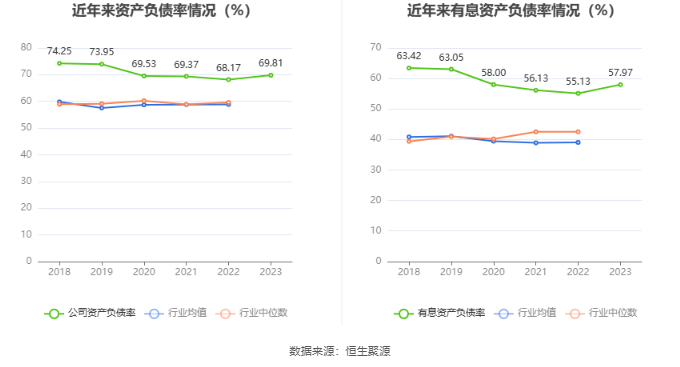 在偿债能力方面,公司2023年年末资产负债率为69.81%,相比上年末上升1.64个百分点;有息资产负债率为57.97%,相比上年末上升2.84个百分点。