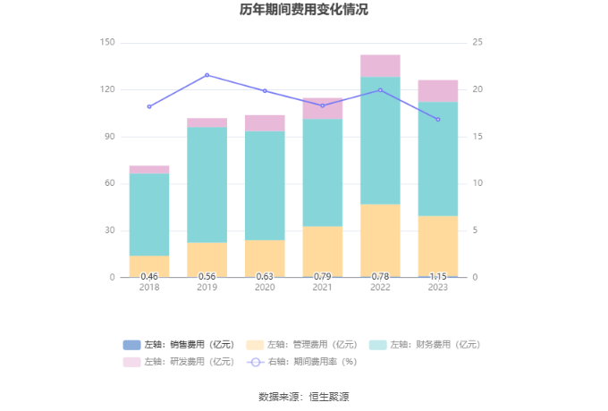 2023年,公司期间费用为126.29亿元,较上年同期减少16.10亿元;期间费用率为16.85%,较上年同期下降3.12个百分点。其中,销售费用同比增长48.1%,管理费用同比下降17.11%,研发费用同比下降1.01%,财务费用同比下降10.35%。