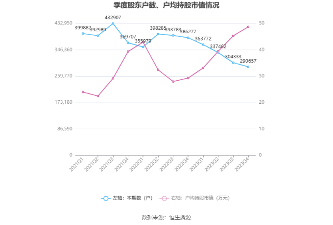 筹码集中度方面,截至2023年年末,公司股东总户数为29.07万户,较三季度末下降了1.37万户,降幅4.49%;户均持股市值由三季度末的45.30万元上升至48.73万元,增幅为7.57%。
