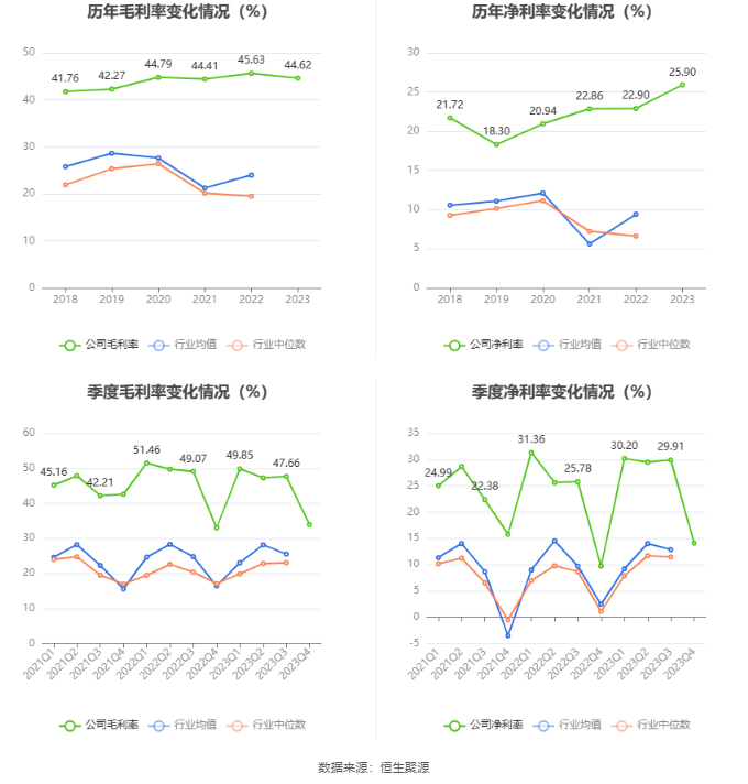 2023年,公司毛利率为44.62%,同比下降1.01个百分点;净利率为25.90%,较上年同期上升3.00个百分点。从单季度指标来看,2023年第四季度公司毛利率为33.90%,同比上升0.88个百分点,环比下降13.76个百分点;净利率为14.10%,较上年同期上升4.36个百分点,较上一季度下降15.81个百分点。