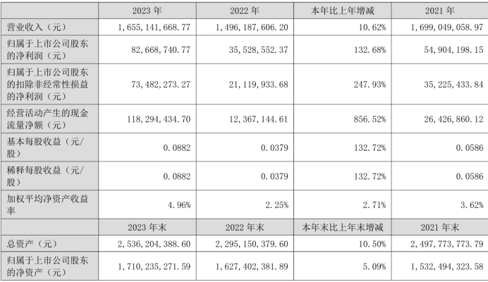 报告期内,公司坚持创新引领的企业发展理念,持续加大研发创新驱动力度,积极应对经营中的挑战,多措并举全面提升整体综合管理能力和产品经营能力,稳扎稳打持续推动公司健康发展。报告期,实现营业收入165,514.17万元,同比增长10.62%;营业利润9,559.53万元,同比增长145.28%;净利润8,778.06万元,同比增长120.49%;基本每股收益0.0882元/股,同比增长132.72%。