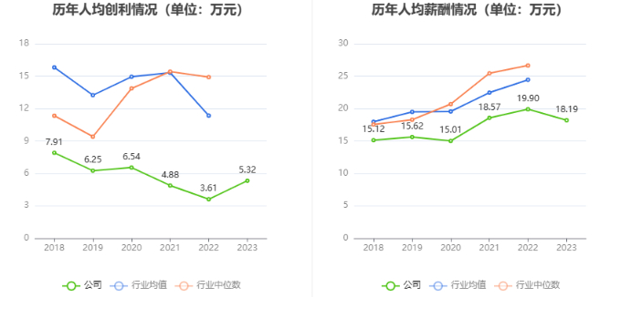 截至2023年末,公司员工总数为2107人,人均创收114.46万元,人均创利5.32万元,人均薪酬18.19万元,较上年同期分别变化-8.38%、47.57%、-8.58%。