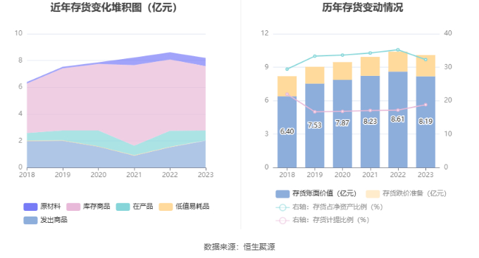 从存货变动来看,截至2023年年末,公司存货账面价值为8.19亿元,占净资产的32.27%,较上年末减少4276.54万元。其中,存货跌价准备为1.9亿元,计提比例为18.82%。