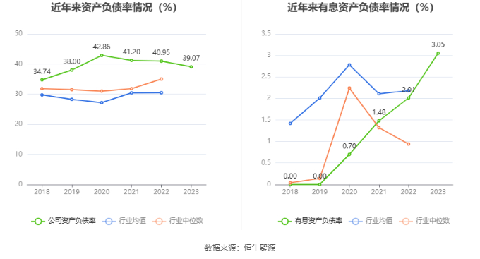 在偿债能力方面,公司2023年年末资产负债率为39.07%,相比上年末下降1.88个百分点;有息资产负债率为3.05%,相比上年末上升1.04个百分点。