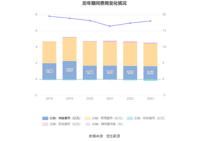 2023年,公司期间费用为4.35亿元,较上年同期减少1942.64万元;但期间费用率为18.05%,较上年同期上升0.64个百分点。其中,销售费用同比下降2.18%,管理费用同比下降3.58%,研发费用同比下降0.55%,财务费用由去年同期的-1372.13万元变为-1915.25万元。