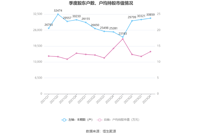 筹码集中度方面,截至2023年年末,公司股东总户数为3.09万户,较三季度末增长了538户,增幅1.77%;户均持股市值由三季度末的11.77万元上升至13.28万元,增幅为12.83%。