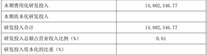 2023年全年,公司研发投入金额为1480.23万元,同比下降0.55%;研发投入占营业收入比例为0.61%,相比上年同期上升0.04个百分点。此外,公司全年研发投入资本化率为0。