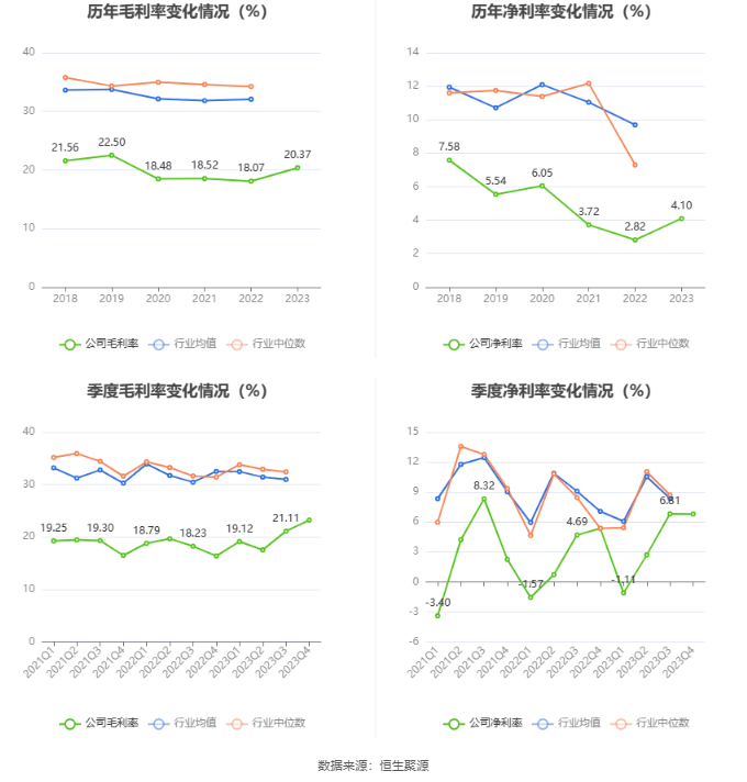 2023年,公司毛利率为20.37%,同比上升2.30个百分点;净利率为4.10%,较上年同期上升1.28个百分点。从单季度指标来看,2023年第四季度公司毛利率为23.22%,同比上升6.84个百分点,环比上升2.11个百分点;净利率为6.80%,较上年同期上升1.44个百分点,较上一季度下降0.01个百分点。
