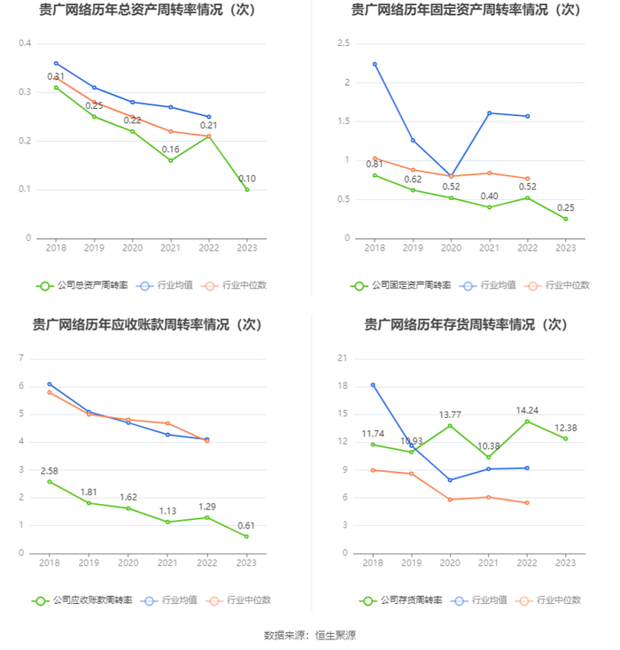 数据统计显示,贵广网络近三年营业总收入复合增长率为-18.90%,在电视广播Ⅲ行业已披露2023年数据的14家公司中排名第14。近三年净利润复合年增长率为-384.34%,排名14/14。
