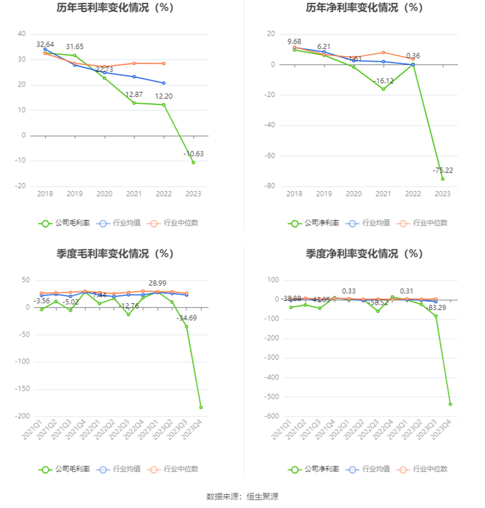 2023年,公司毛利率为-10.63%,同比下降22.83个百分点;净利率为-75.22%,较上年同期下降75.58个百分点。从单季度指标来看,2023年第四季度公司毛利率为-183.54%,同比下降201.83个百分点,环比下降148.85个百分点;净利率为-537.37%,较上年同期下降552.51个百分点,较上一季度下降454.08个百分点。